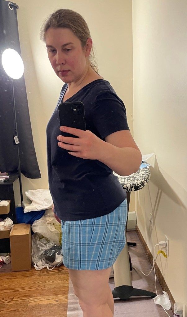 In the past I used to serge then fold to the inside and then topstitch over the serged edge, but I find myself preferring to try new things and do finishes like this lately. Helps distract from some recent sadness like my father’s health struggles and losing my beloved cat recently. (My dad actually improved enough that he was able to go home to my mom a couple of weeks ago, but I’m still doing a significant amount of caregiving duties. And while my cat had some health struggles the past six months, I wasn’t anticipating losing him quite so soon and miss him terribly.)