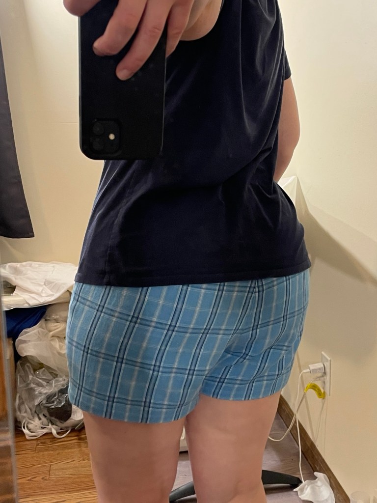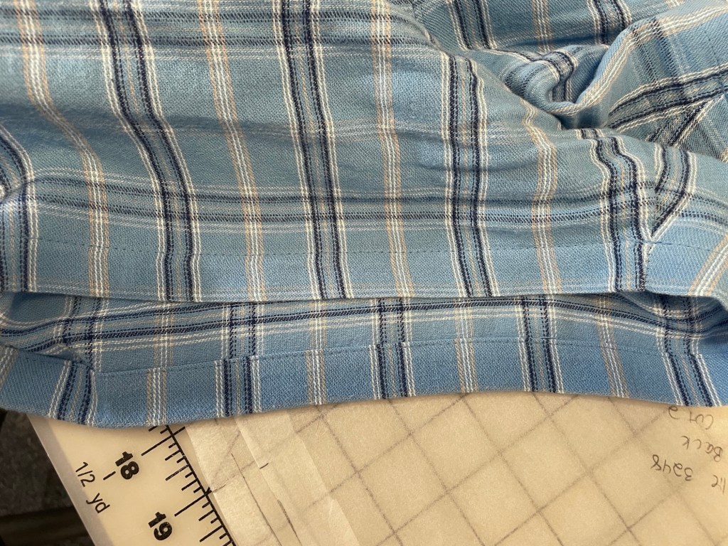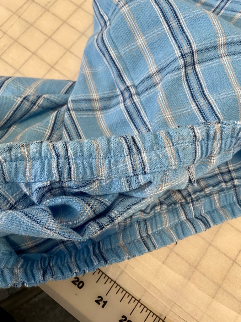 I cut a size CC based on my hip measurement. For alterations I added 2.5” to the center back seam height, tapering to nothing at the center front. I also added 1/4” width to the front inseam. I left the pockets off because these are for pajamas and I just didn’t want to deal with trying to pattern match that.