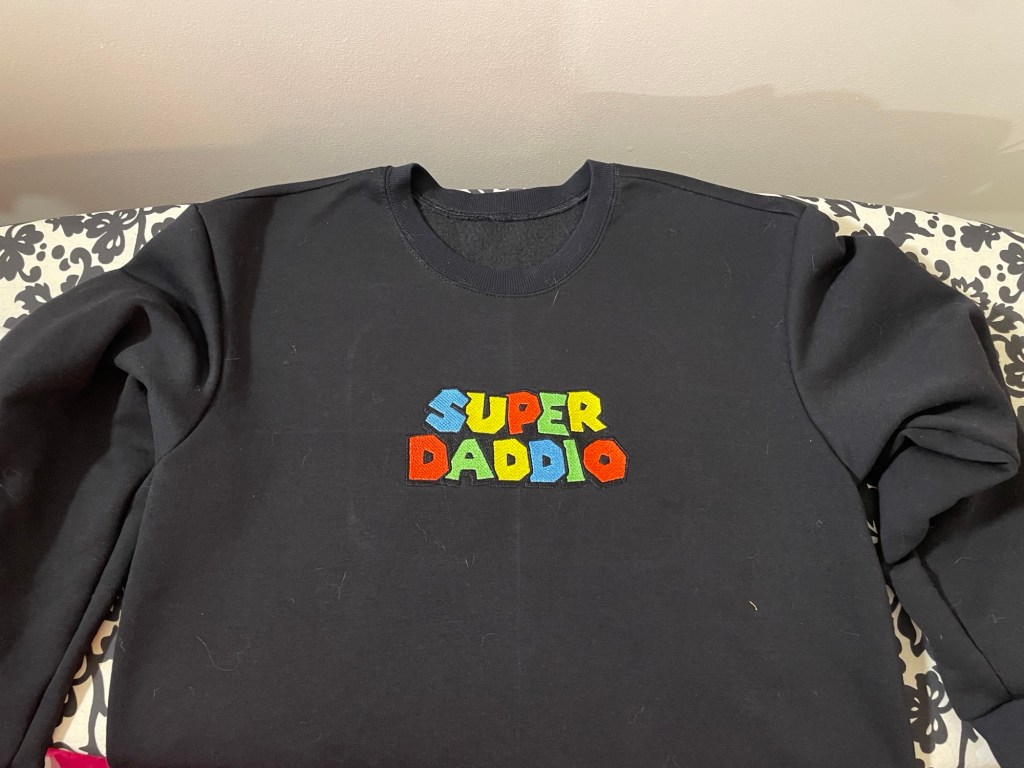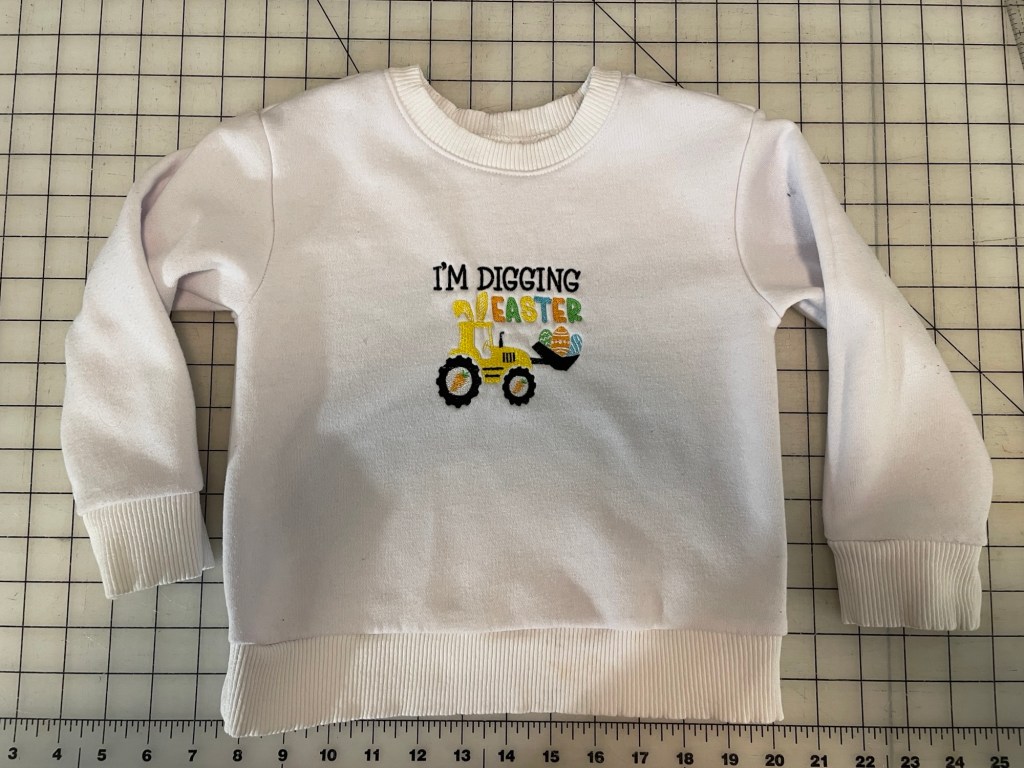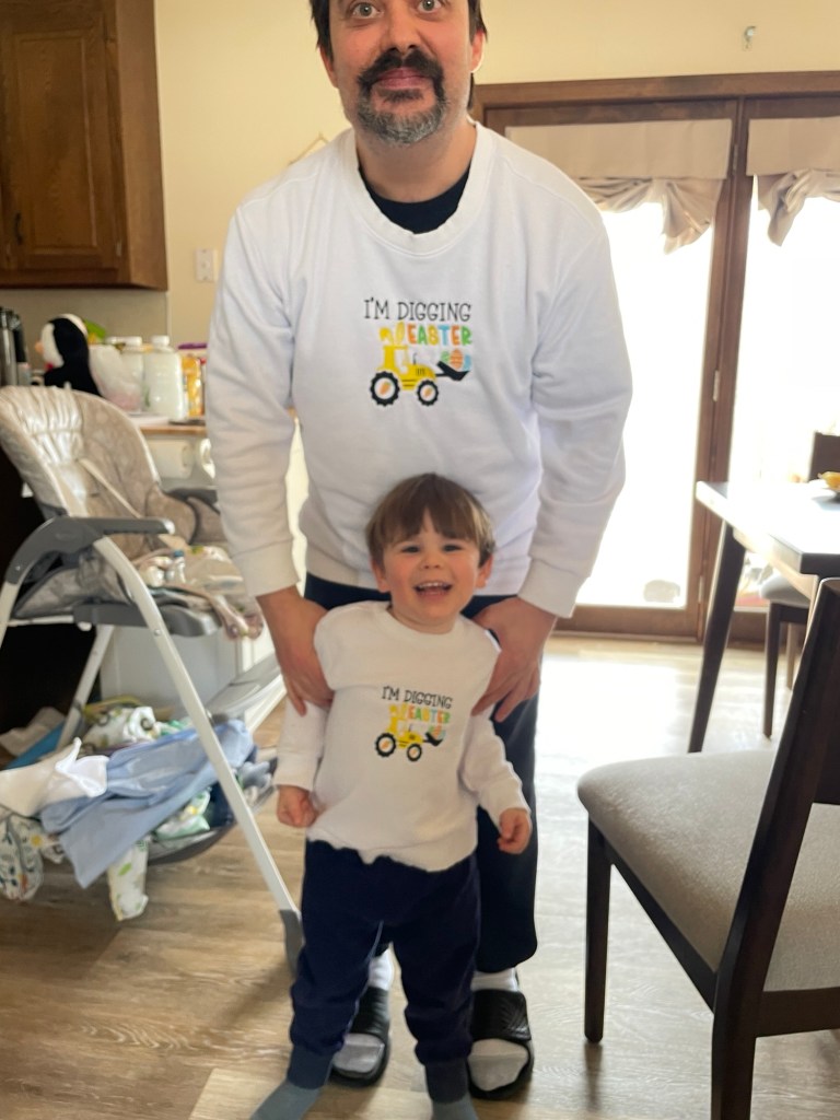 I made this several times so far for both my husband and son. The latest version, which is shown in the photos, were matching Easter sweatshirts. I embroidered both of them on the ancient Janome 300e my mom gave me last fall (another new obsession of mine). The machine is ancient and was sitting in a closet completely untouched for about 20 years. I oiled the bobbin and needle bar and have been using it ever since. I had to hunt on Amazon for memory cards that would actually work and designs often require me to do some rotation and size adjustment in Ink/Stitch, but I’m making it work.