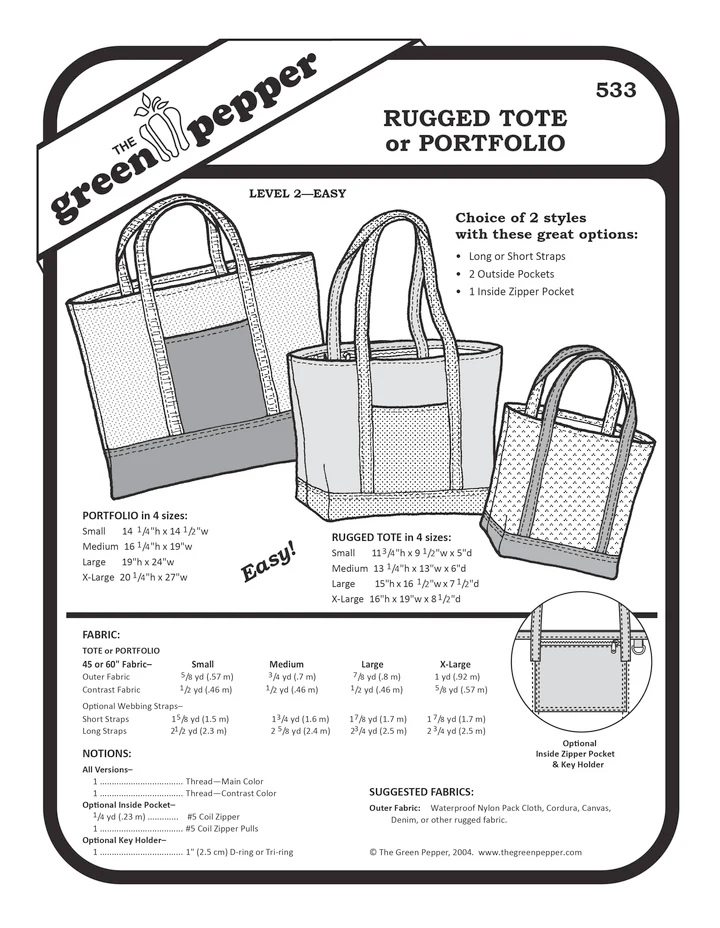 The Rugged Tote and Portfolio from The Green Pepper is an unlined tote bag with optional exterior pockets, a zipped interior pocket, and D-ring for keys. You can use either webbing or self fabric for the straps, which come in regular and long lengths. The bottom of the bag is actually a double layer of fabric, as a separate bag bottom is sewn onto the main body of the tote. If you made it out of 24 oz canvas it would be very similar to the LL Bean Boat and Tote.