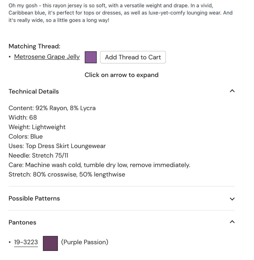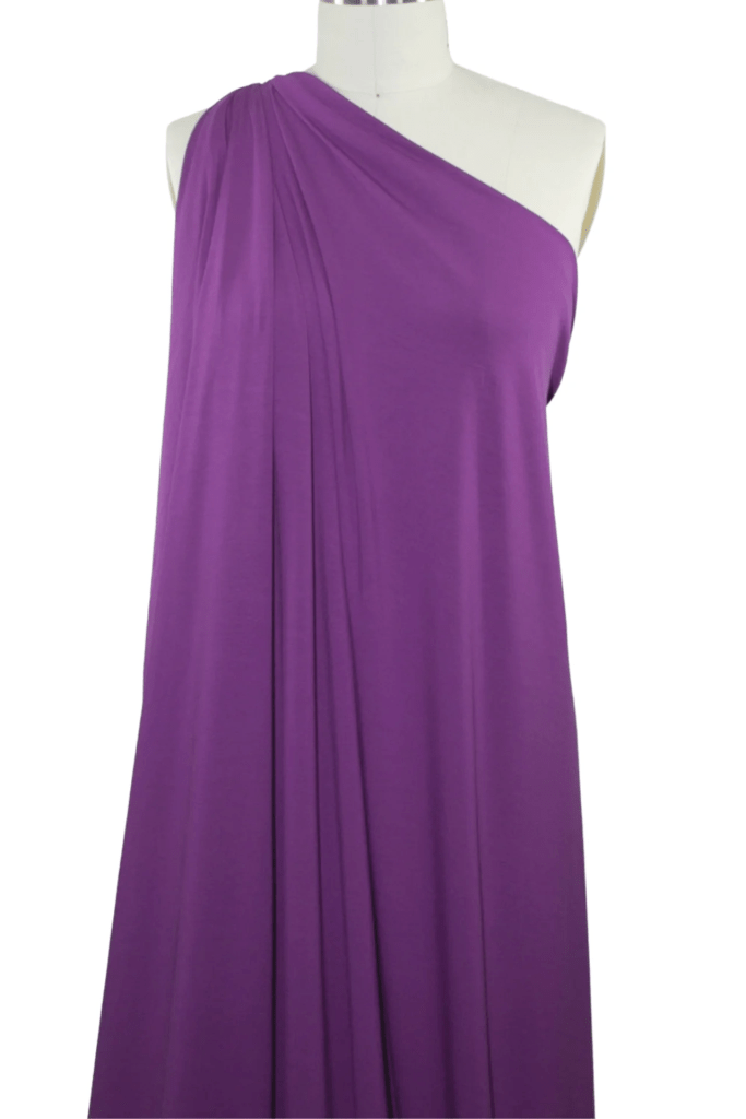 The fabric I used was a stretchy purple knit from Gorgeous Fabrics (still some in stock). I believe it is mismarked as while the description says rayon/lycra jersey, the dry hand and slightly stiffer drape feels more like a cotton/lycra jersey.