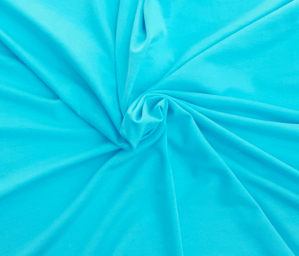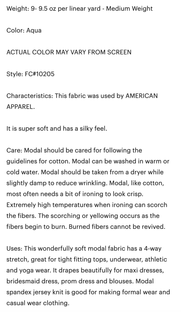 My first version was a modal/lycra jersey. Even though the description calls it aqua and shows a bright blue, the fabric I actually received was closer to a seafoam green.