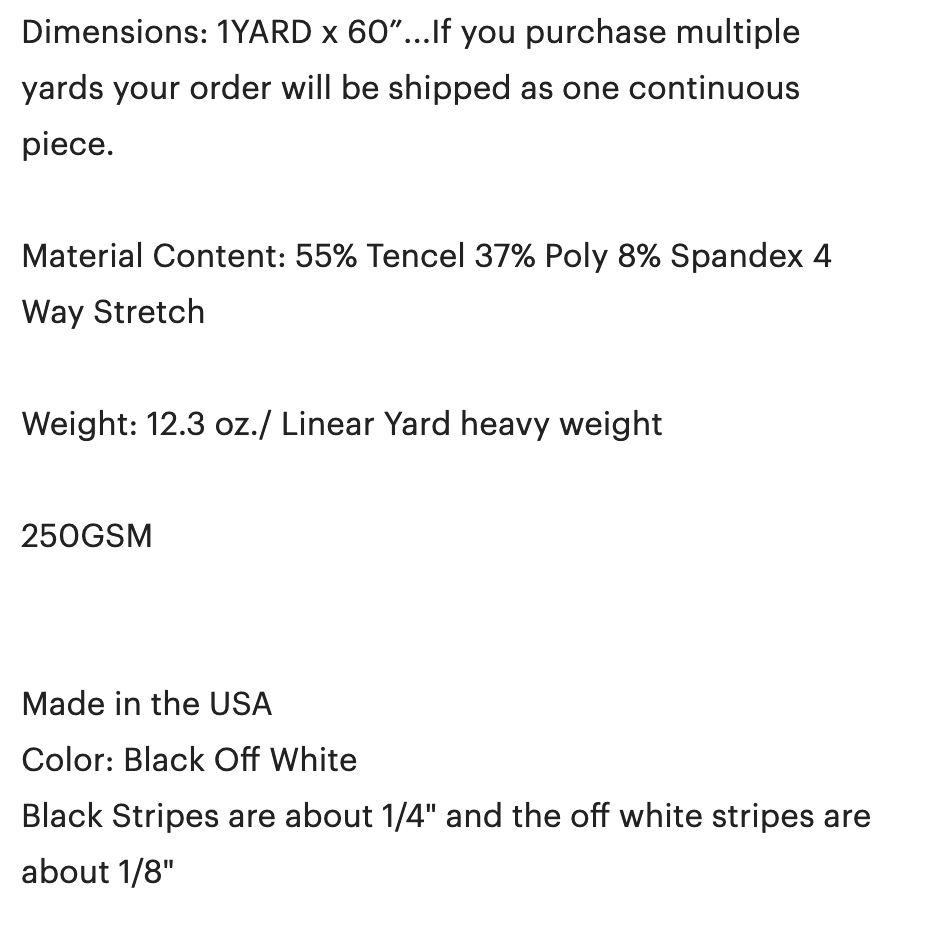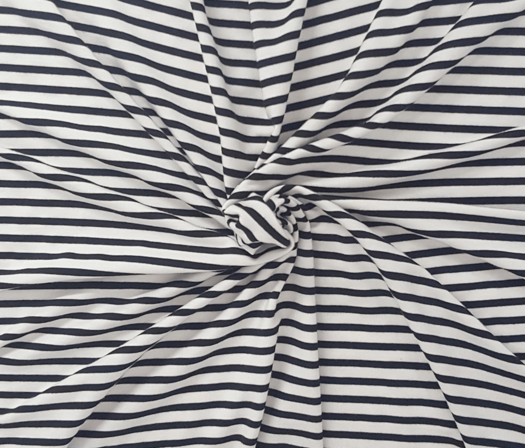 My second version was a 1/4″ black and off-white striped tencel/poly/lycra jersey. This one had the least amount of stretch out of all the fabrics I used, and the fabric feels slightly less delicate due to the polyester content. It was wonderful to work with!