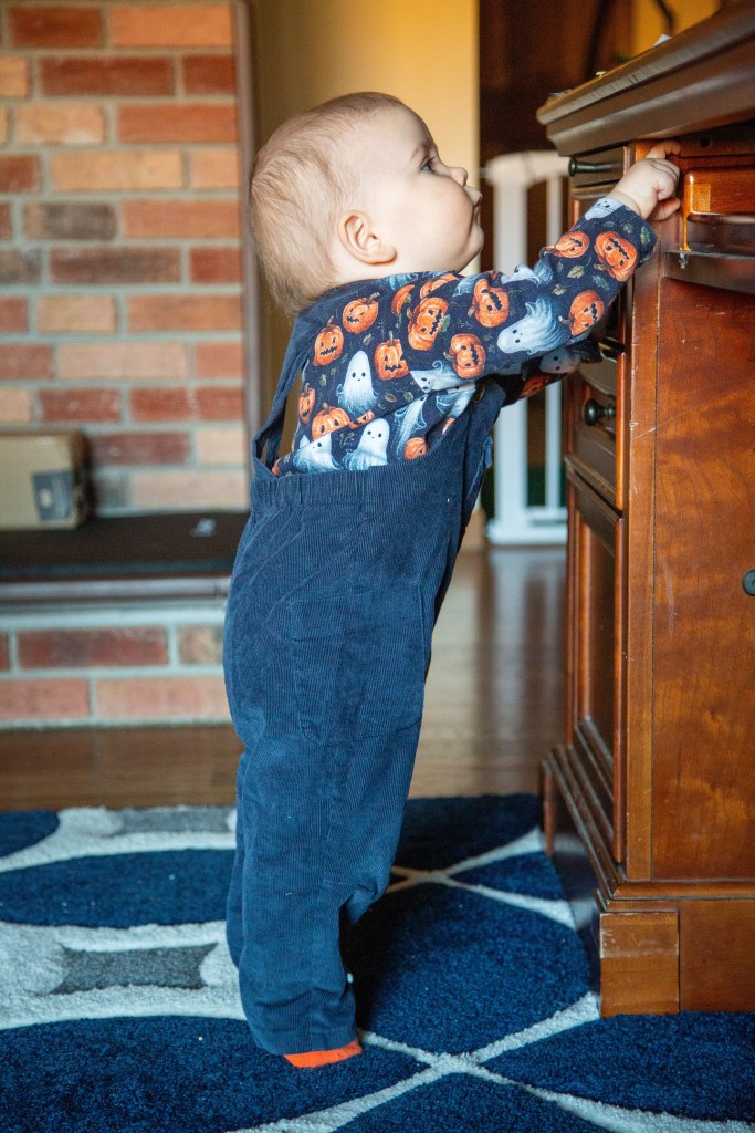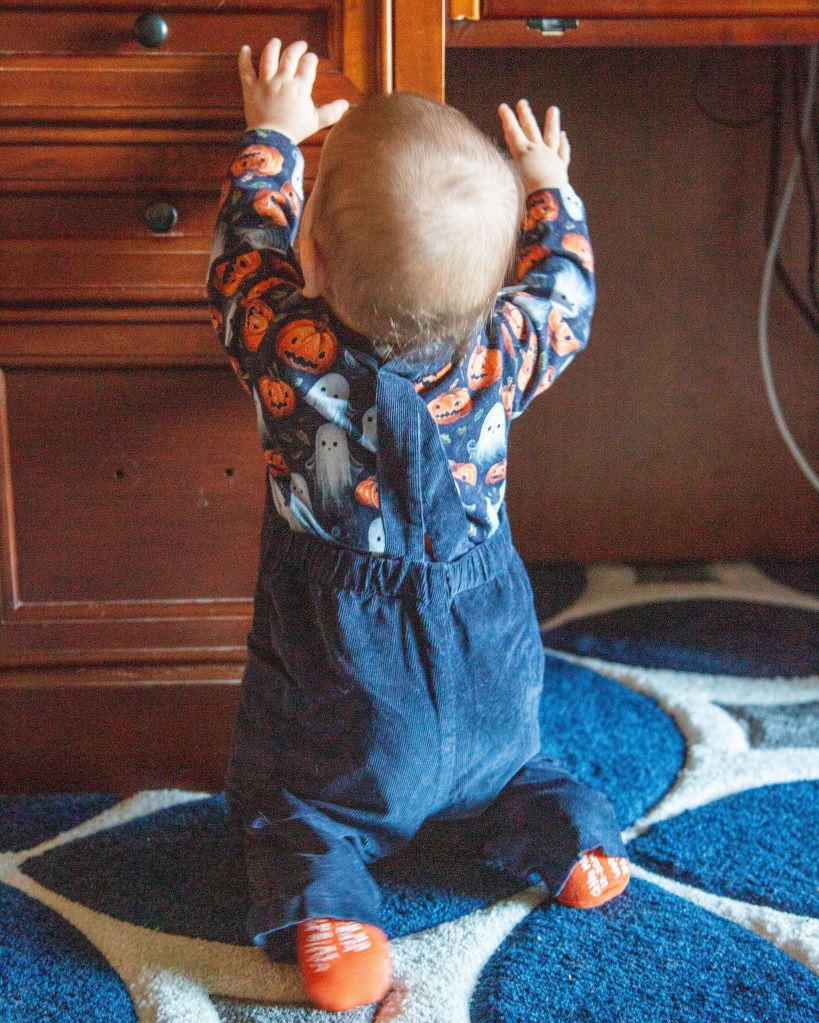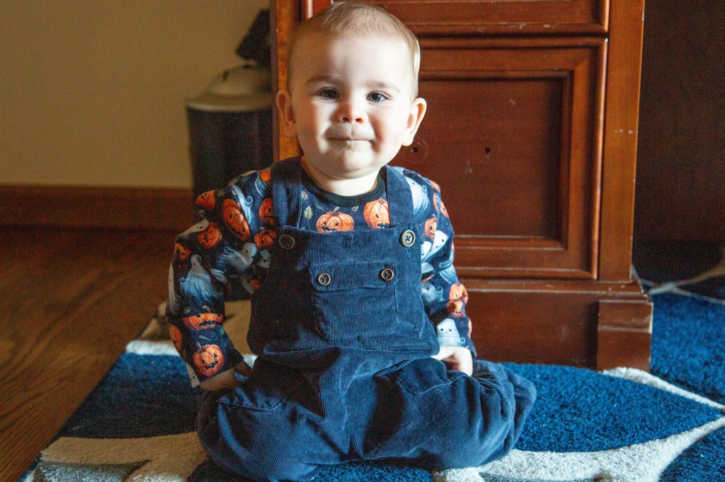 I made these about six weeks ago and chose a size 80, as I was paranoid it wouldn’t still fit for Halloween. Well, as with the Green Bean baby set I should have instead gone with an altered 74. It ended up too big. I usually cuff both the sleeves and pants legs. In the photos they look particularly loose because he’s got a disposable diaper on today instead of a cloth one, so there’s far less bulk in the seat area.
