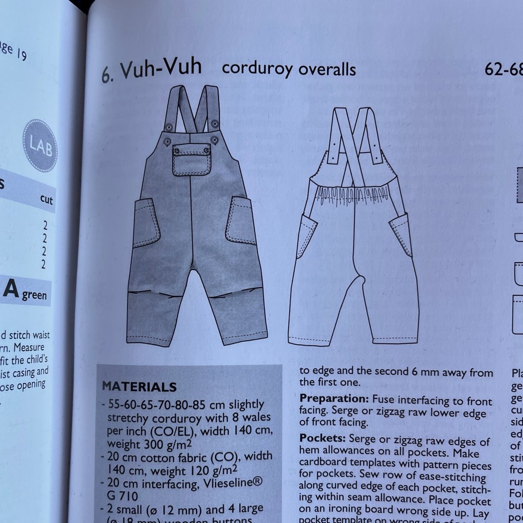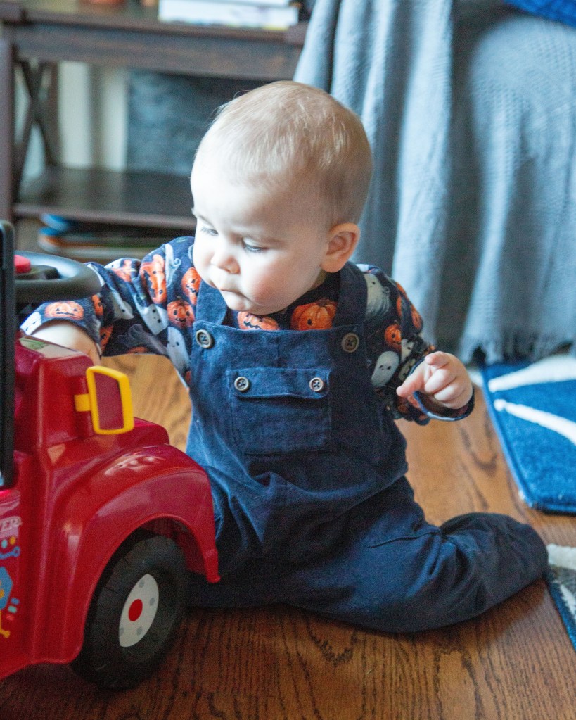 The overalls are drafted for woven fabrics. There’s two offset pockets (one at each hip) and one pocket at the chest with a non-working buttoned flap. The straps cross at the back and have two buttons on each strap for better sizing as your child grows. There’s also tucks at the knees to help facilitate room for crawling (which I really appreciate for him right now!) and elastic at the back waist to help keep things snug.