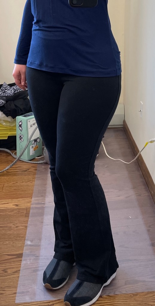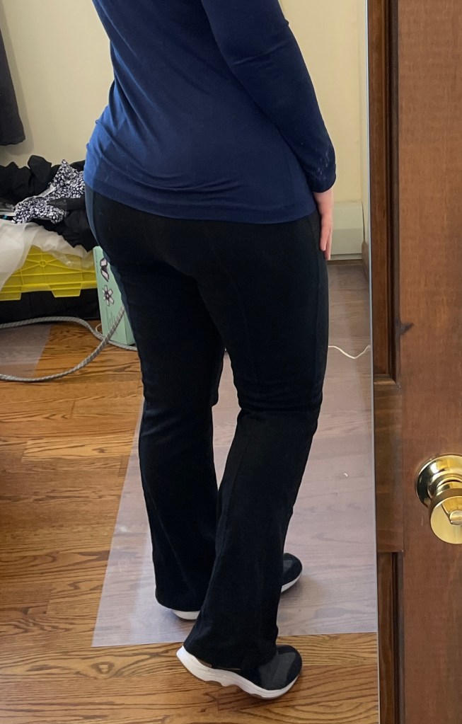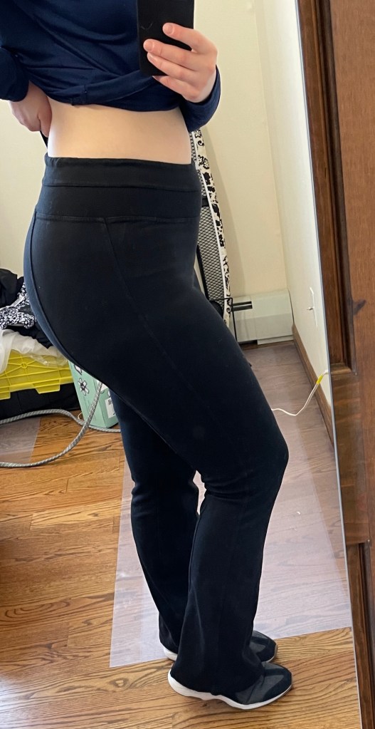 These yoga pants have a bootcut leg, optional topstitched seams, and and upper and lower waistband which can be used with a contrast fabric. The waistband is secured with 3/8” elastic at the upper edge. The back is split into two pieces, which is great if you’re like me and always dealing with gaping at the center back!