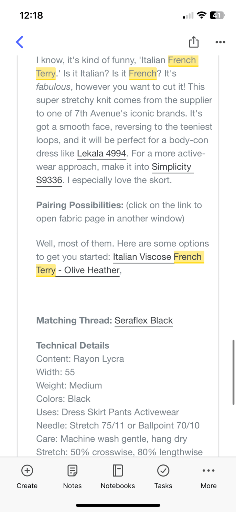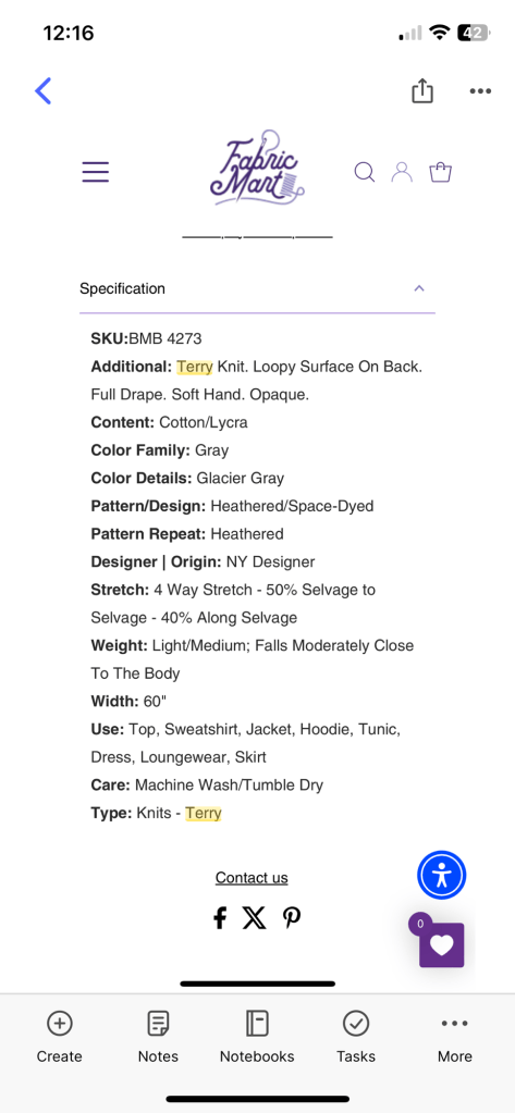 For my second version (which is shown in the photos above) I used an Italian viscose/lycra French terry from Gorgeous Fabrics.