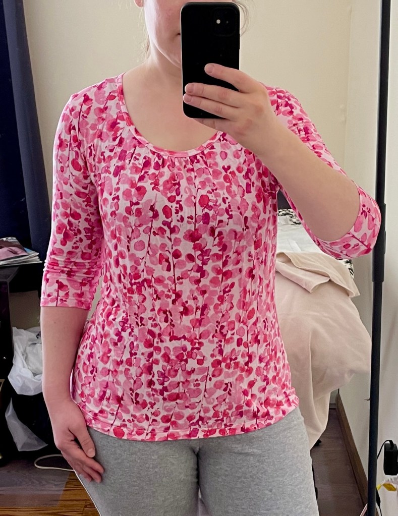 Your Tee shirt looks great! I love the gathered neckline and the pretty print