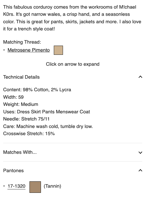 I used a slightly stretchy fine wale corduroy, purchased from Gorgeous Fabrics last year.