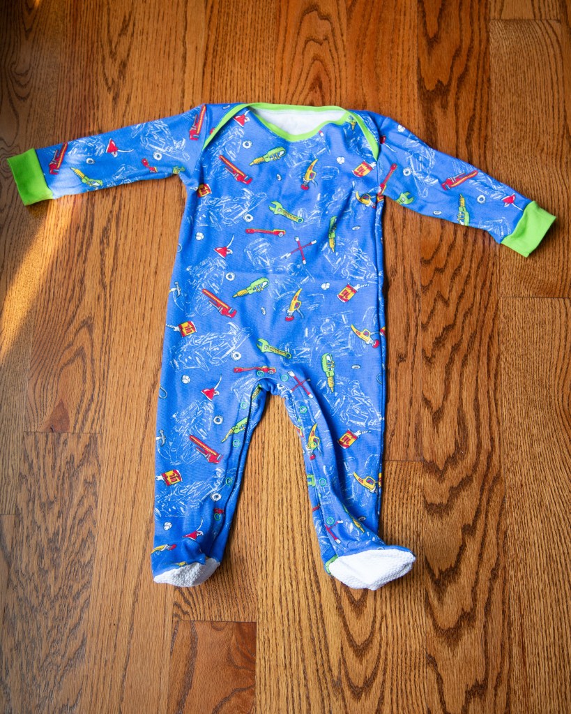 Per the pattern he was right between size 74 and 80. Since it’s always better to go bigger rather than smaller I chose size 80 for the first round. I made him footie pajamas with snaps at the legs. It was HUGE on him. Have to set it aside for later!