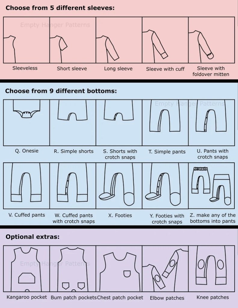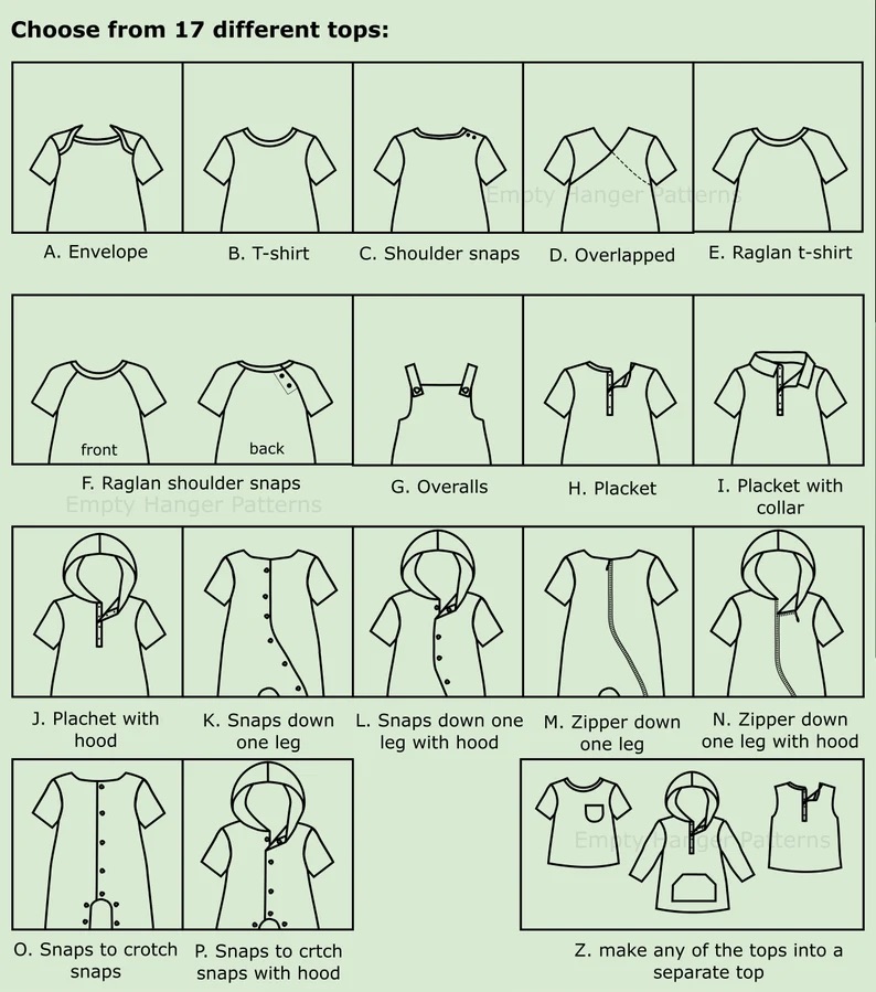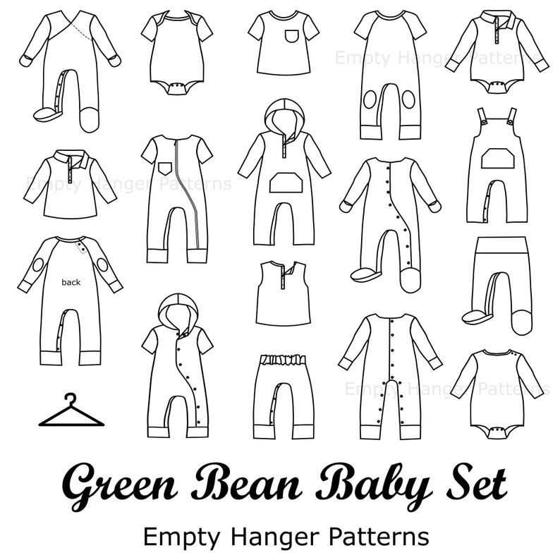 The Green Bean Baby Set by Empty Hanger Patterns is sold on Etsy. It is a PDF sewing pattern that includes a basic onesie with cutting lines and instructions for all sorts of variations. Rather than nesting the sizes like most pattern companies, they have you print by size and nest the basic variations. Extra pattern pieces for things like cuffs, a hood, etc are printed off as necessary. Make sure you read the instructions as all the information you need on which pages to print is found there.