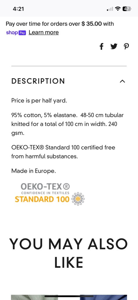 For the top I used a cotton/lycra jersey from Nature’s Fabrics. I had it leftover from another project and it was just enough to squeeze this shirt out of it.